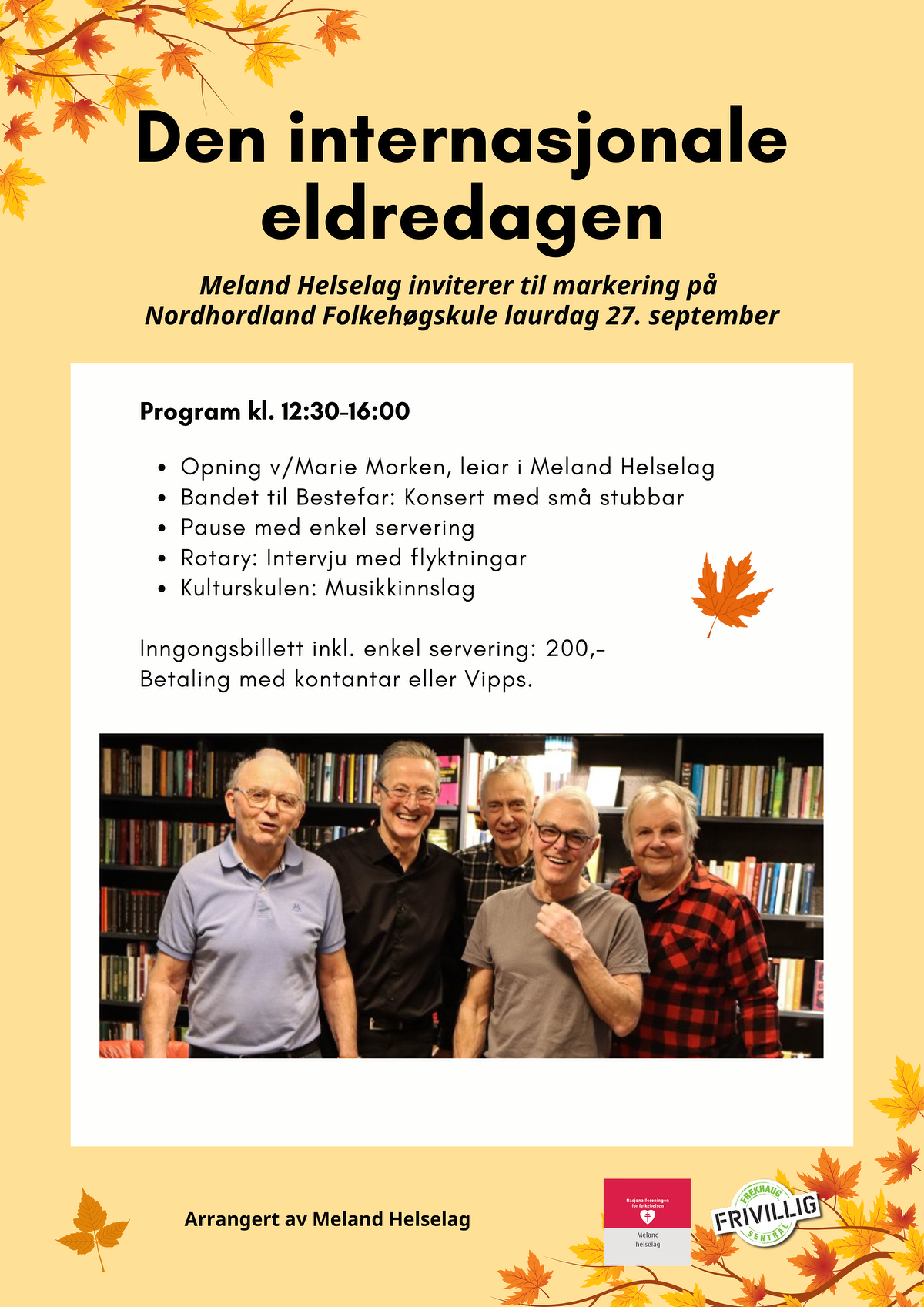 Inspirasjonsdag - ope kommunehus på Frekhaug.Den internasjonale eldredagen vert markert 27. september 2025 på Frekhaug . I år vert arrangementet på Nordhordland Folkehøgskule, og det er Meland Helselag som arrangerar. Velkomen til ei kjekk markering!